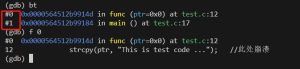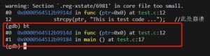 //测试程序 //文件:test.c #include <stdio.h> #include <string.h> void func(char *ptr) { strcpy(ptr, "This is test code ..."); //此处崩溃 } int main() { char *ptr = NULL; func(ptr); return 0; } - 编译: