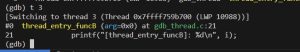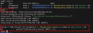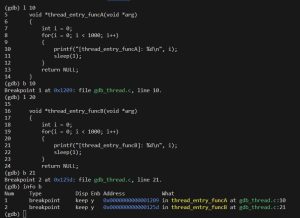 (gdb) info b Num Type Disp Enb Address What 1 breakpoint keep y 0x0000000000001209 in thread_entry_funcA at gdb_thread.c:10 2 breakpoint keep y 0x000000000000125d in thread_entry_funcB at gdb_thread.c:21运行程序: