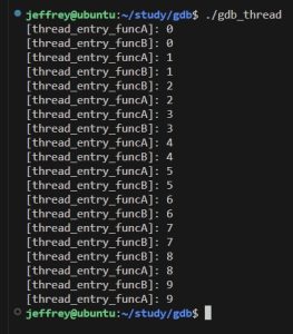 //文件名:gdb_thread.c #include <stdio.h> #include <unistd.h> #include <pthread.h> void *thread_entry_funcA(void *arg) { int i = 0; for(i = 0; i < 10; i++) { printf("[thread_entry_funcA]: %d\n", i); sleep(1); } return NULL; } void *thread_entry_funcB(void *arg) { int i = 0; for(i = 0; i < 10; i++) { printf("[thread_entry_funcB]: %d\n", i); sleep(1); } return NULL; } int main() { pthread_t tidA, tidB; int ret = pthread_create(&tidA, NULL, thread_entry_funcA, NULL); if(ret < 0) { perror("pthread_ create"); return 0; } ret = pthread_create(&tidB, NULL, thread_entry_funcB, NULL); if(ret < 0) { perror("pthread_ create"); return 0; } pthread_join(tidA, NULL); pthread_join(tidB, NULL); return 0; } - 编译和运行输出: