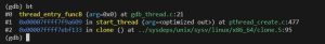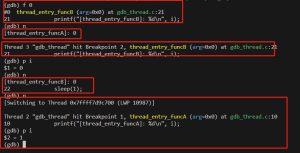 看到崩溃位置,可以看到func函数入参ptr为0x0。GDB调试多线程