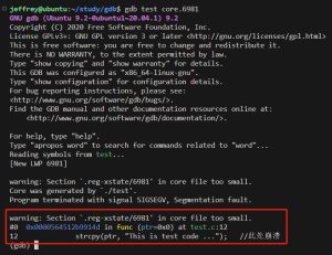 ./test,输出:Segmentation fault (core dumped),生成core文件:core.6981(6981为pid); - 调试命令:格式"