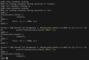f 0切换到对应堆栈,n命令单步执行,打印出了[thread_entry_funcA]: 0,然后线程id为3的线程运行到断点2,打印一下变量i的值:p i,单步执行后打印了[thread_entry_funcB]: 0,再执行后又切换到线程id为2后运行到断点1,打印i值。** - gdb中调度器锁