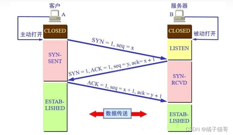 - 第三次握手:客户端收到确认报文之后,通知上层应用进程连接已建立,并向服务器发出确认报文,其首部:ACK=1,ack=y+1。当服务器收到客户端的确认报文之后,也通知其上层应用进程连接已建立。客户端和服务端状态都变为ESTABLISHED状态。
